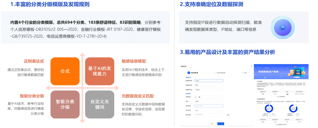 通过隐私计算、联邦学习技术,实现数据不出域的前提下输出并交付计算结果;支持数据交易信息区块链存证,实现交付印证和监管;支持智能扫库和数据分类分级策略配置,实现低成本、自动化的数据资产管理